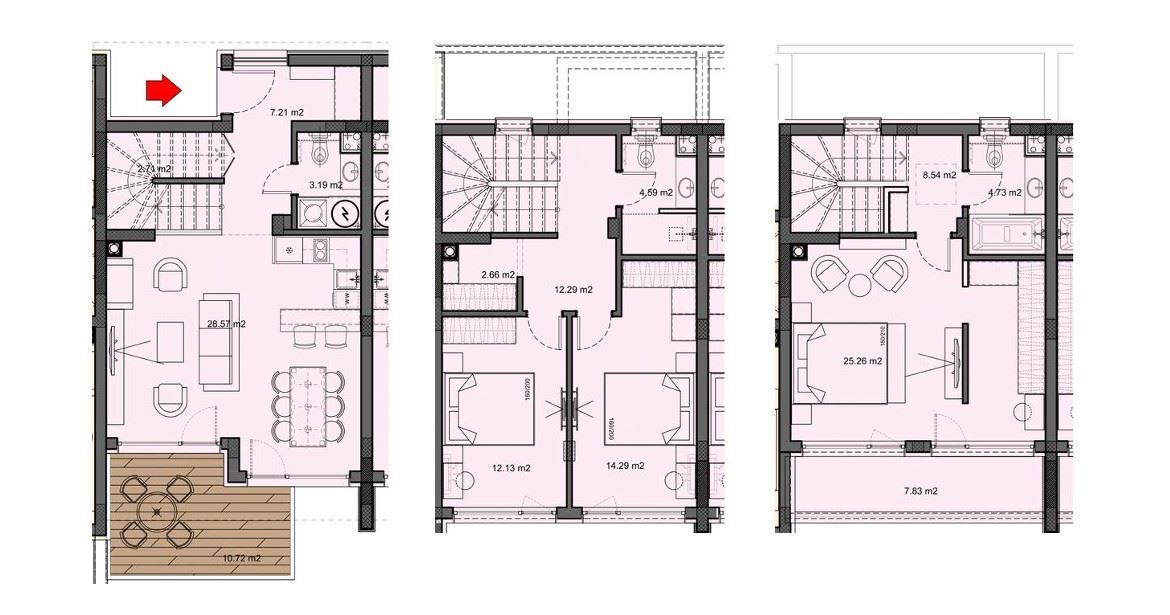 Key features: townhouse in Nessebar; total area – 164.79 m²; garden – 158.93 m²; three levels; 3 bedrooms; 3 bathrooms; 1 balcony; veranda; private parking; part of a gated complex of 44 detached houses; 500 m from the sea; next to the Aqua Park.